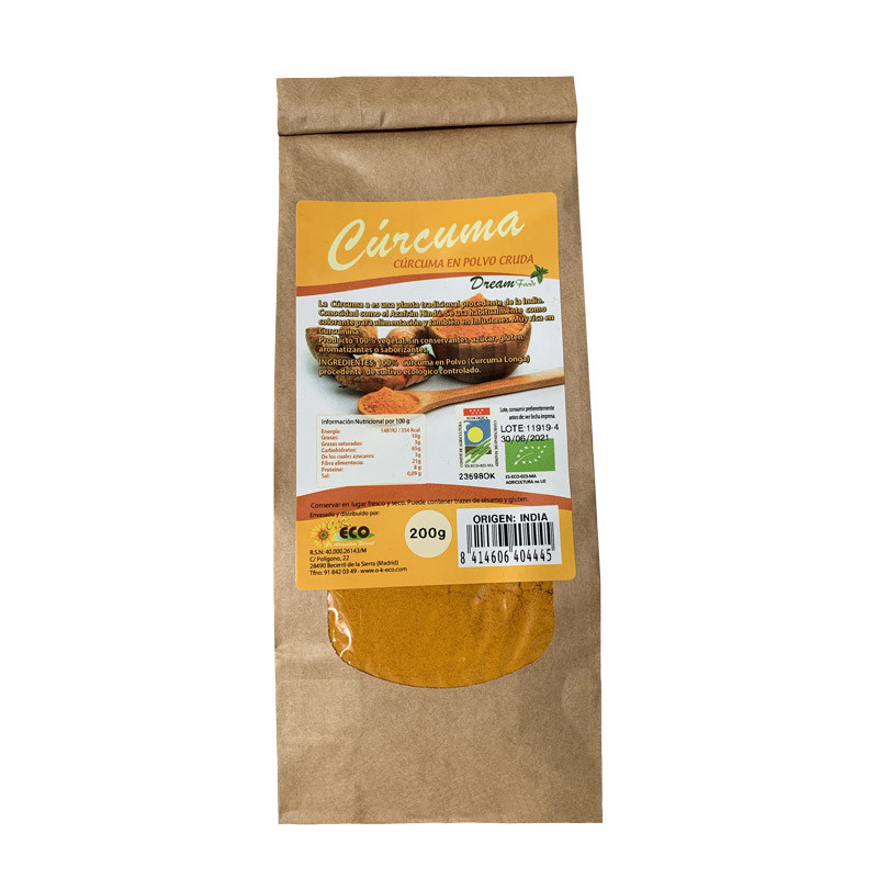 Açafrão é uma planta tradicional da Índia. Conhecido como o açafrão hindu. Geralmente é usado como coloração para alimentos e também em infusões. Muito rico em curcumina. Produto vegetal 100%, sem conservantes, açúcar, glúten, aromatizações ou aromas.) Da cultura ecológica controlada. Saturados: 3 Ghydrates de Carbono: 65 g-de que açúcares: 3 gfibra: 21 gproteínas: 8 gsodio: 38 mg