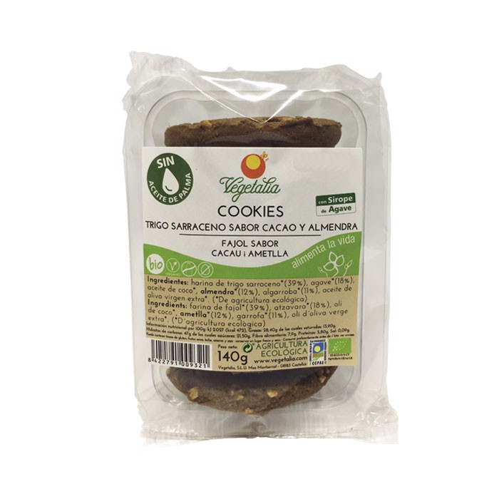 biscoitos ecológicos de cacau sarracene de trigo e sabor de amêndoa, adoçado com xarope de agave. Biscoitos sem lactose, sem ovo e sem óleo de palma.