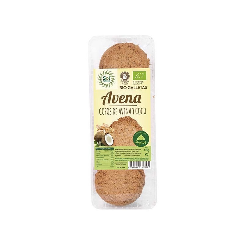 Biscoito de coco e aveia de agave* 41%, margarina vegetal não hidrogenada* (coco), xarope de agave* 15%, coco* 13,2%, flocos de aveia* 9,3%e azeite extra -virgem extra*.* Ingredientes da agricultura orgânica Informações nutricionais (100 g): -fibra 12,8 g -sódio 0,02 g