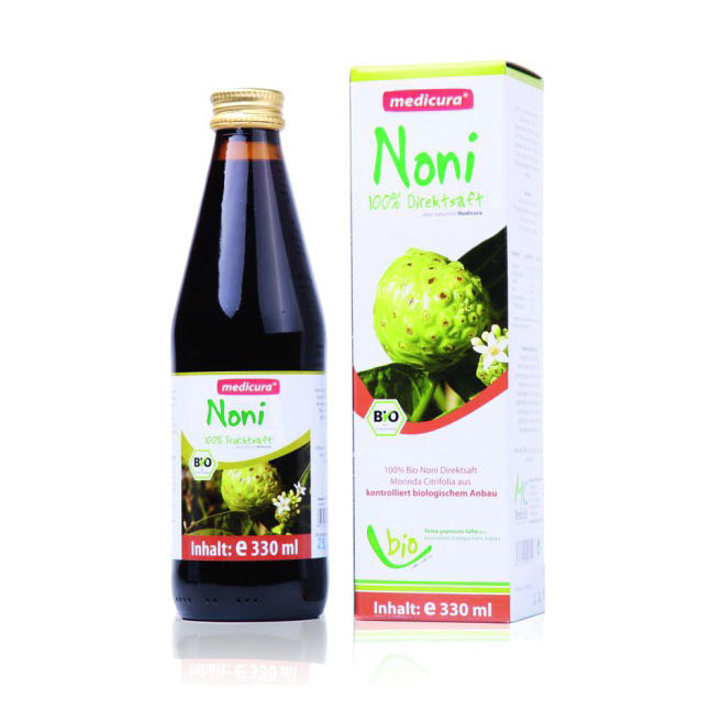 100% de suco noni, da Agricultura Orgânica 100% do Noni Suco (Morinda citrifolia), certificação ecológica e primeira pasteurização, preparada a partir de frutas maduras espremidas. A fruta usada para sua elaboração é frutas selvagens, coletadas em seu estado ideal de maturação. O suco noni não contém aditivos, conservantes, água ou outros sucos adicionados e não é reconstituído. As possíveis diferenças de cor e textura do suco noni se devem às mudanças sazonais da própria fruta noni.