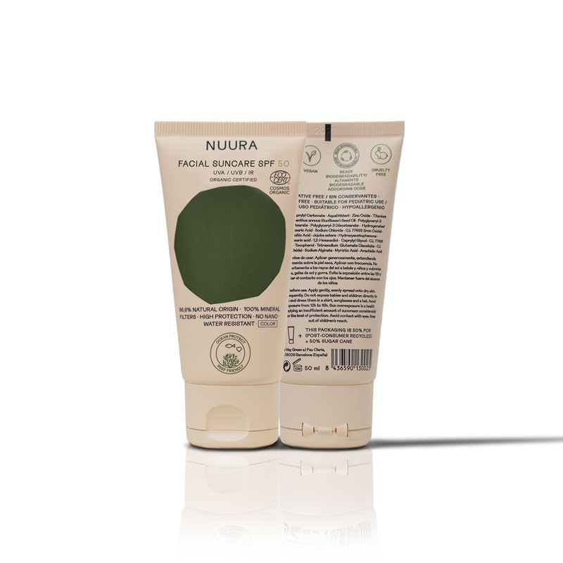 O creme facial Nuura possui um fator 50 de proteção solar e cobre homogeneamente a pele graças aos filtros minerais. É especialmente projetado para pele sensível, reativa e branca.